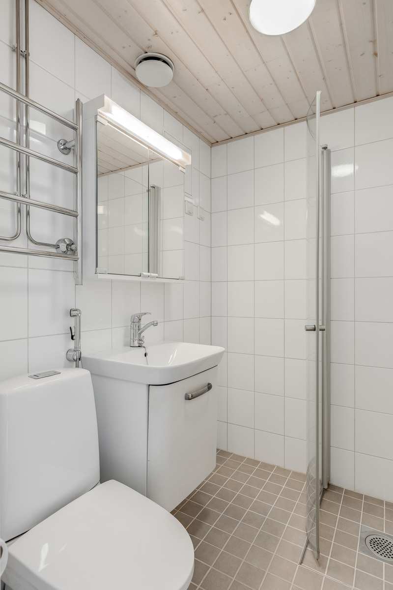 Kylpyhuone | Varusteet: suihkuseinä, pesukoneliitäntä, wc-istuin, suihku, peilikaappi, kylpyhuonekaapisto Seinät: kaakeli Lattia: laatta |