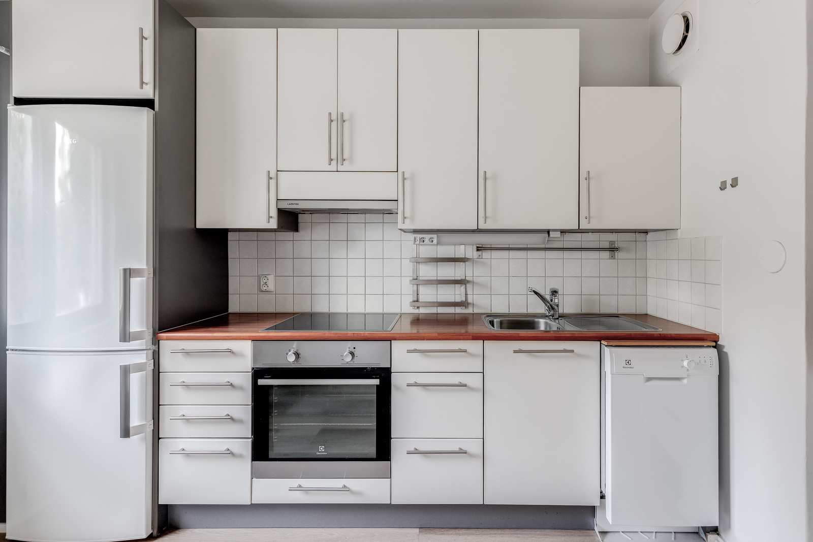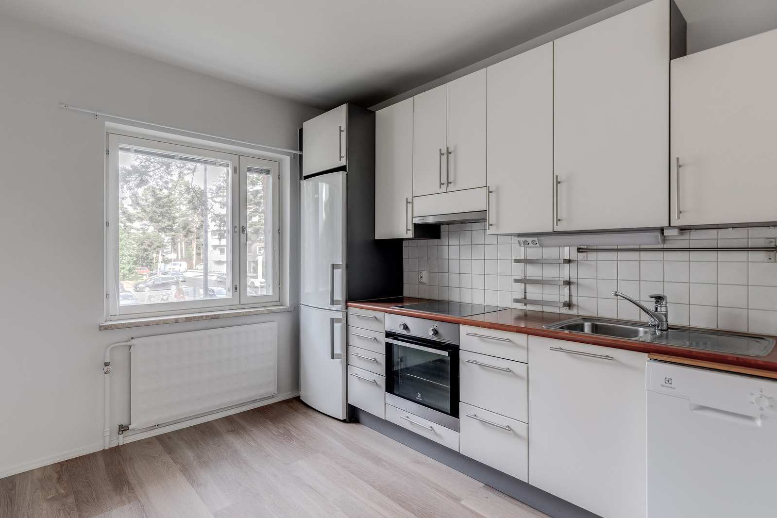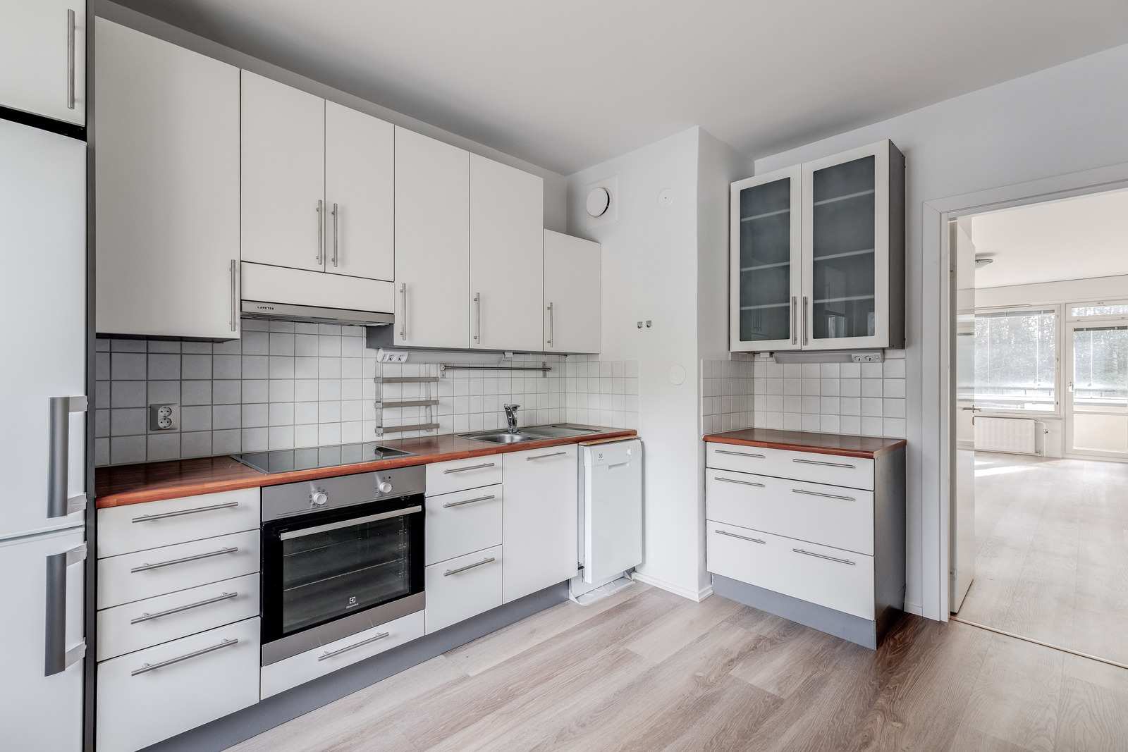 Keittiön varustus | Jääkaappi ja pakastin: jääkaappi/pakastin Muut varusteet: liesituuletin, astianpesukone Seinät: maalattu Lattia: vinyyli Liesi/uuni: keraaminen, erillisuuni |