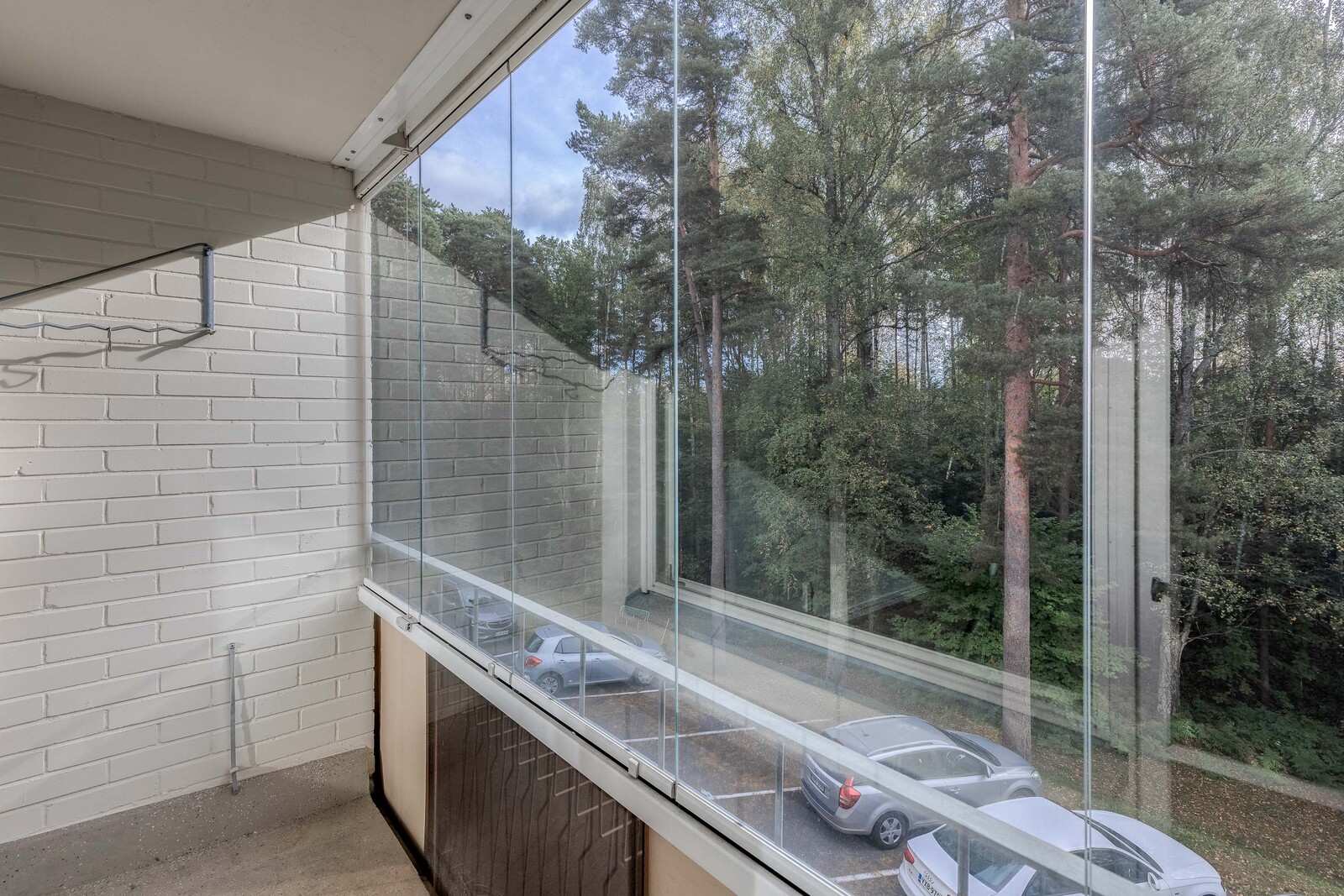 Asunnon olohuoneesta avautuu näkymä lasitetulle parvekkeelle, joka tuo tilan tuntua ja tarjoaa vehreät maisemat. Suuri ikkuna tuo runsaasti luonnonvaloa, ja selkeä pohjaratkaisu tekee arjesta sujuvaa. Käytännöllinen ja todella tilava keittiö tarjoaa mukavat puitteet ruokailuun. Kylpyhuone on uusittu putkiremontin yhteydessä vuonna 2012, ja sinne mahtuu myös pieni pesukone.