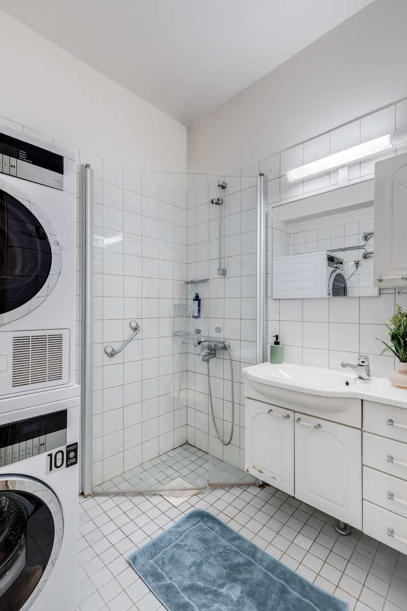Kylpyhuone | Varusteet: suihkuseinä, pesukoneliitäntä, wc-istuin, suihku, peilikaappi, kylpyhuonekaapisto Seinät: kaakeli Lattia: laatta |