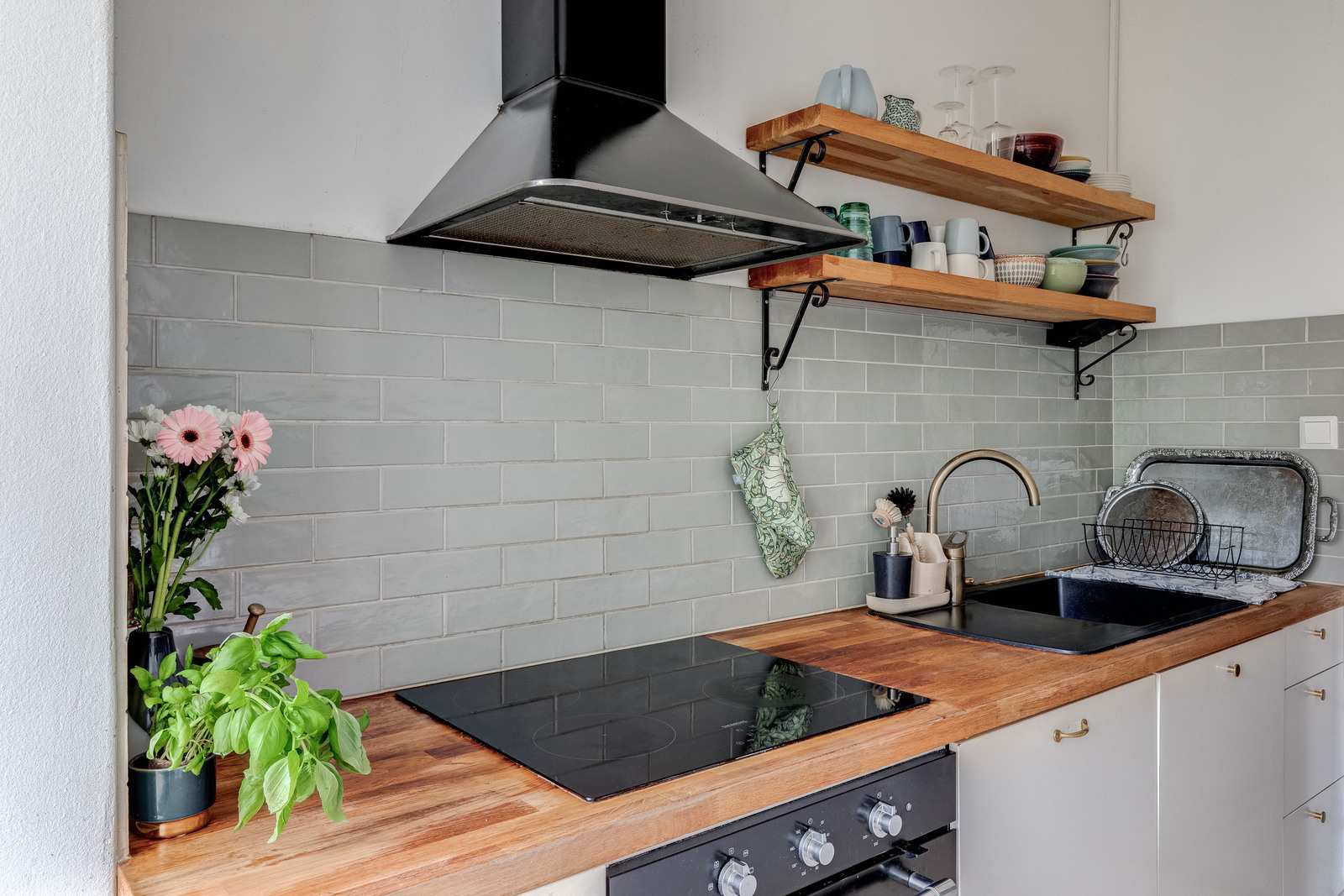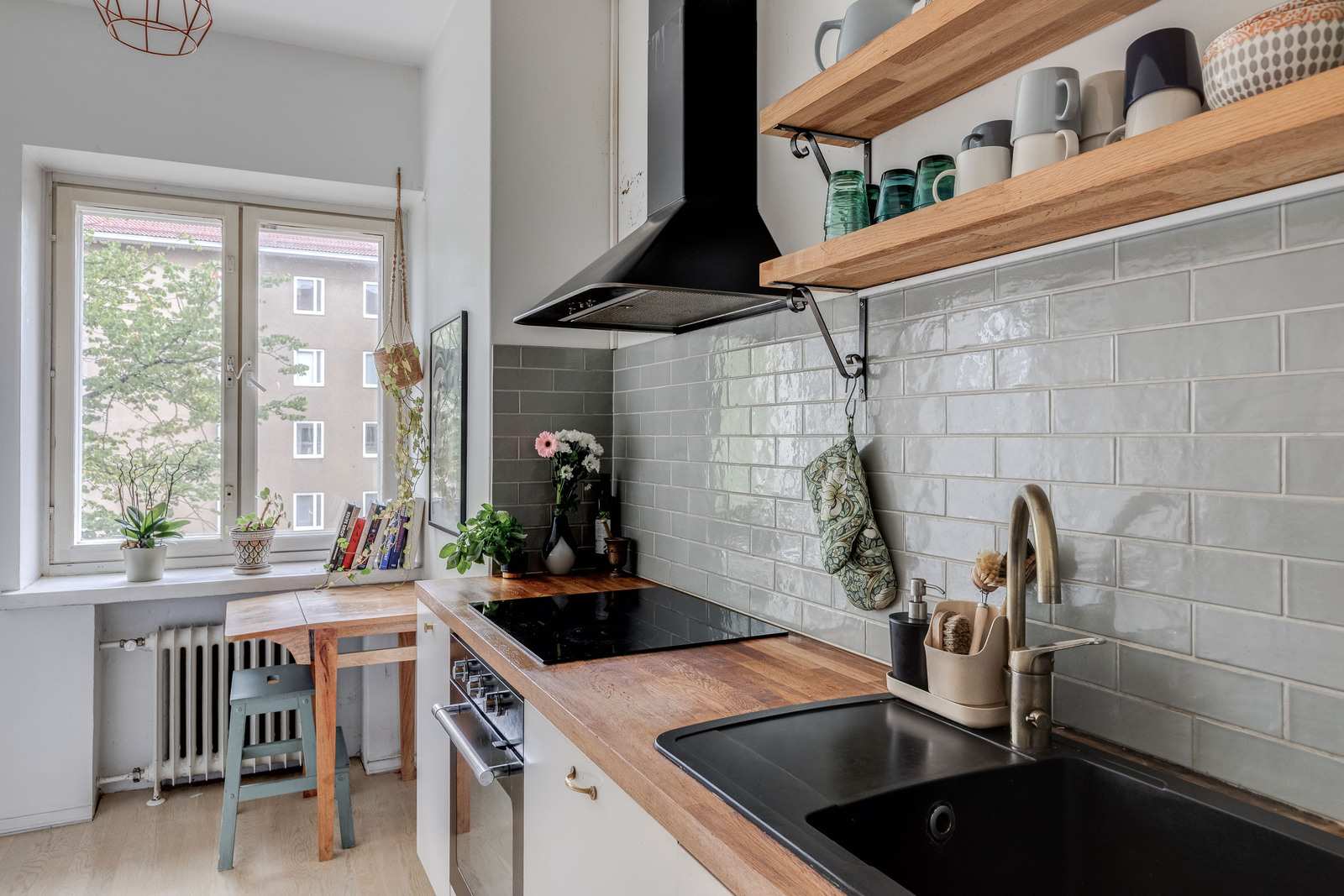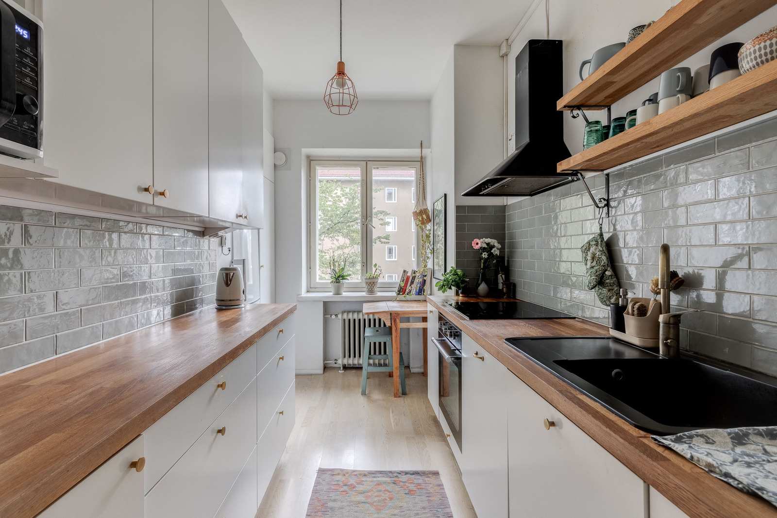 Keittiön varustus | Jääkaappi ja pakastin: jääkaappi/pakastin Muut varusteet: mikroaaltouuni, astianpesukone, kiinteät valaisimet, liesituuletin / suodatin Seinät: kaakeli, maalattu Lattia: parketti Liesi/uuni: induktio, erillisuuni |