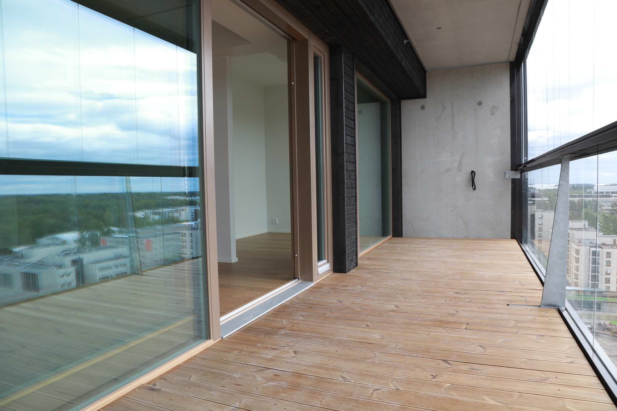 Kodin ehdoton valttikortti on tilava lasitettu parveke, joka toimii lähes ylimääräisenä huoneena aikaisesta keväästä pitkälle syksyyn. Näkymät ovat avarat ja rauhalliset.