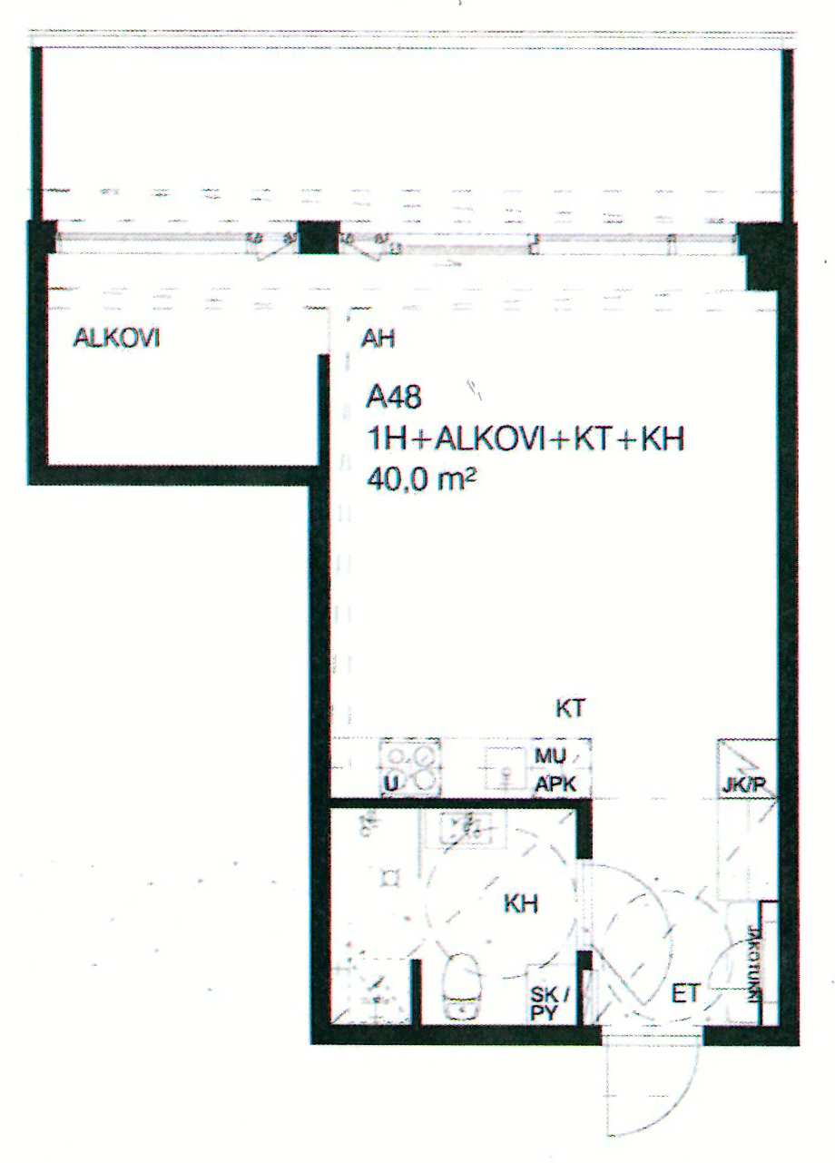 Huoneiston selkeä pohjaratkaisu tekee tilasta avaran ja toimivan. Valoisa olohuone ja moderni avokeittiö muodostavat yhtenäisen kokonaisuuden, johon on helppo sisustaa viihtyisä oleskelualue. Makuualkovi luo oman rauhallisen nukkumistilan, ja suuret ikkunat tuovat asuntoon runsaasti luonnonvaloa.