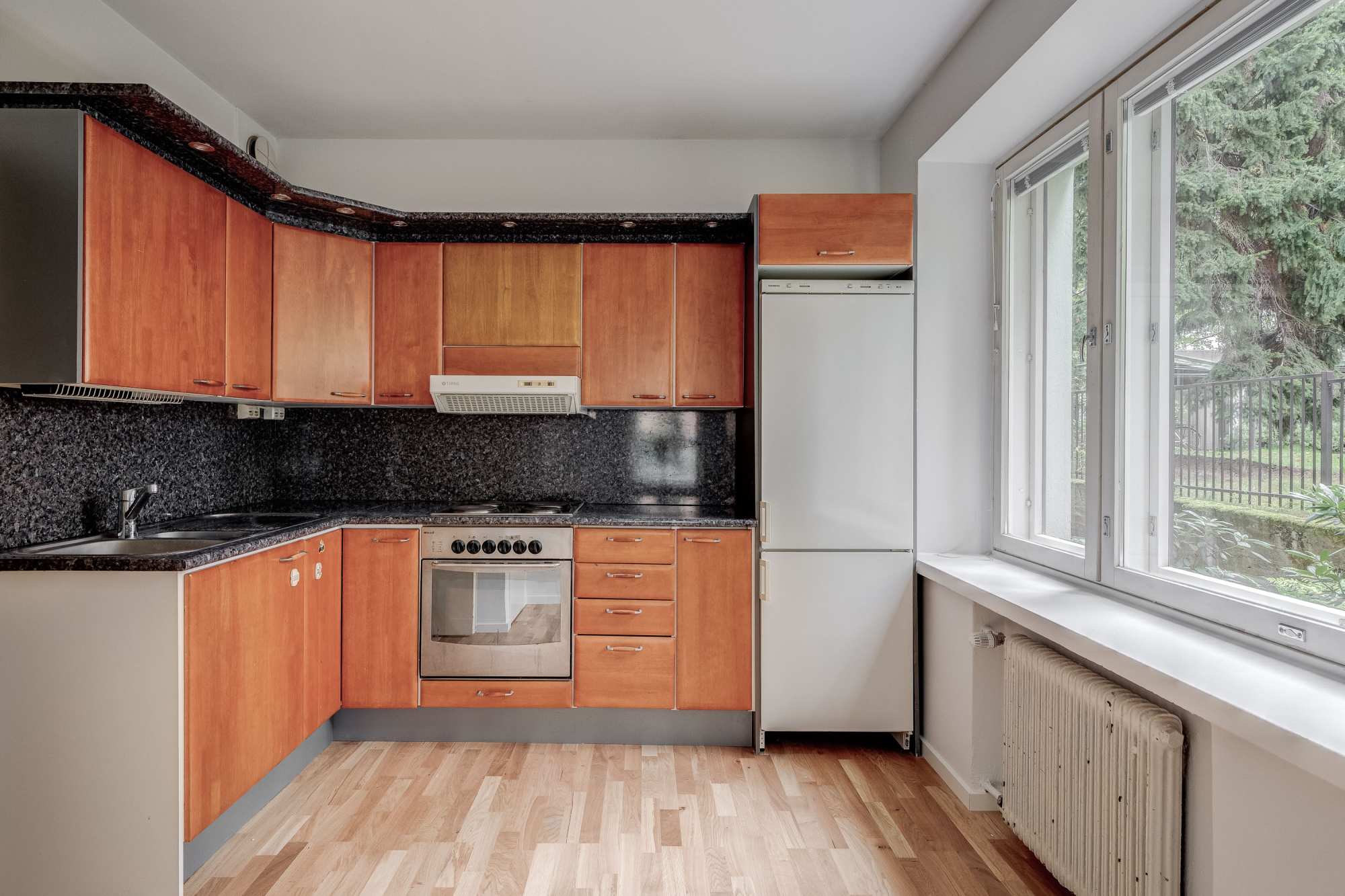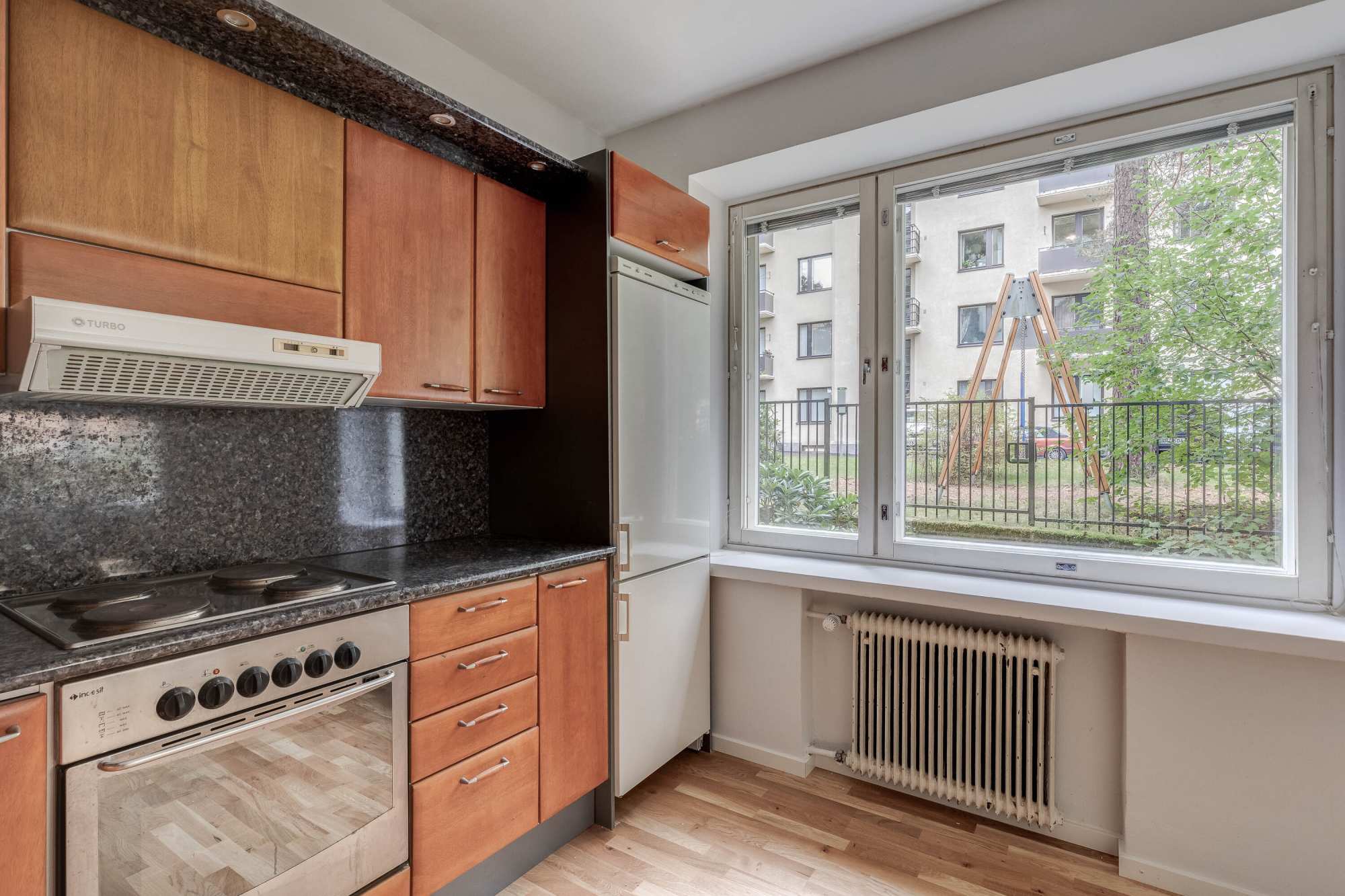 Tervetuloa tutustumaan tähän hurmaavaan, vuonna 1937 rakennettuun kerrostalokotiin, joka huokuu ajan henkeä ja tarjoaa modernin asumismukavuuden historiallisessa ympäristössä. Tämä 37 m²:n kokoinen, ensimmäisen kerroksen kulmahuoneisto sijaitsee rauhallisella ja vehreällä alueella arvostetussa Munkkiniemessä.